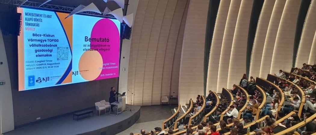 Nagy érdeklődést mutatott meghívott előadónk, Czeglédi Tímea előadása, aki a Bács-Kiskun Vármegye TOP100 vállalkozásának gazdasági elemzésének folyamatát mutatta be. Prezentációjában kitért az adatgyűjtés lehetséges módszereire, a KSH adatszolgáltatásira, avagy az Opten forrásból származó térítésmentes adatokban rejlő lehetőségekre is. Részletesen bemutatta a regionálisan nagy jelentőséggel bíró, a Bács-Kiskun Vármegyei Kereskedelmi és Iparkamara által kiadott TOP100-as, évente megjelenő és mindig nagyon látványos kiadvány elkészítésének folyamatát, az alapadatok átvételétől kezdve, az elemzéseken át, egészen a tetszetős grafikus megjelenésig és a kiadványt bemutató rendezvényig.